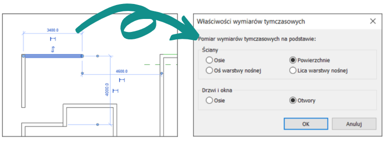 - Aby włączyć: zakładka Zarządzaj >> panel Ustawienia >> lista rozwijana Ustawienia dodatkowe >> Wymiary tymczasowe. W oknie dialogowym ustawień możesz ustawić, od którego elementu ściany, będzie dokonywane mierzenie oraz jak będę się zachowywać wymiarowanie w odniesieniu do okien i drzwi.