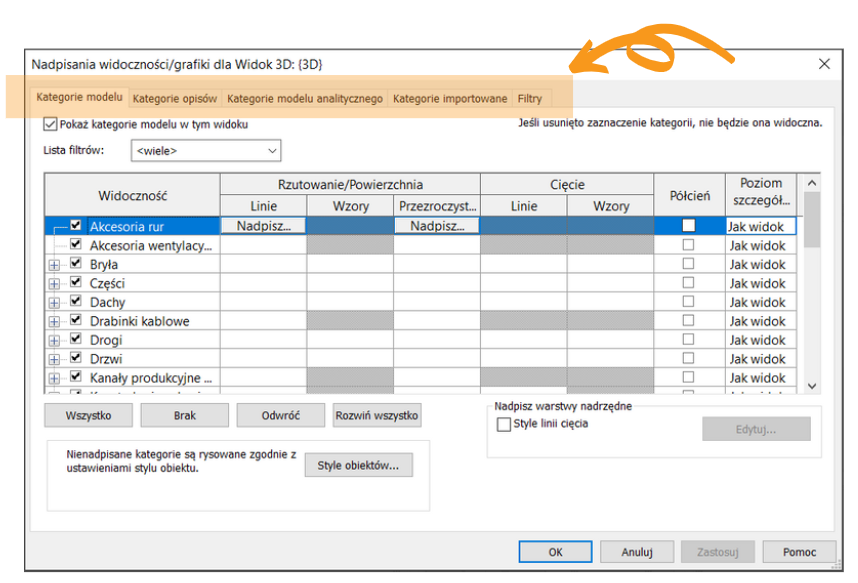 - Stan widoczności oraz wygląd każdej kategorii i elementów można modyfikować w każdym widoku projektu.
