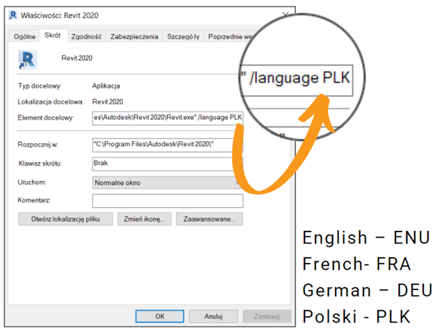 Aby zmienić język programu: Ikona programu >> prawym przyciskiem myszki, rozwiń listę dialogową z poleceniami >> wybierz Właściwości >> okno dialogowe, zakładka Skrót >> Element docelowy >> zmień kod PLK na ENU – jeśli chcesz mienić język na angielski.