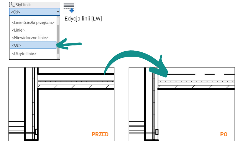 Jest to narzędzie które umożliwia na rysunku, nadpisanie grafiki jednej, wybranej linii. Często stosowałam to polecenie przy czyszczeniu przekroju ze zbędnych krawędzi. Modyfikować możesz dowolną linię, na wcześniej zdefiniowane linie z poziomu Ustawień. Możesz w dowolnej chwili przywrócić oryginalny styl linii, na zmienionej krawędzi. Na aktywnym widoku uruchom polecenie Edycja linii, a następnie z listy rozwijanej stylu linii wybierz opcję Według kategorii i zaznacz krawędź.