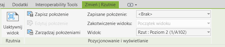 Opisywana funkcjonalność dostępna jest po zaznaczeniu widoku umieszczonego na arkuszu, a następnie przejściu do karty Zmień | Rzutnie i panelu Pozycjonowanie i widok. Możliwe jest tam ustalenie punktu odniesienia do zapamiętania.