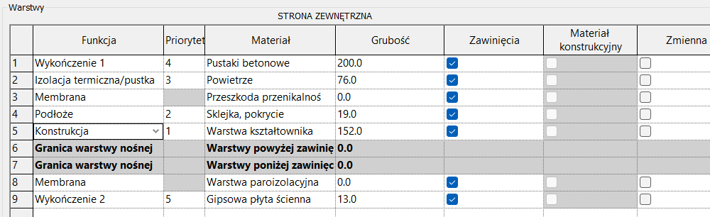 Okno edytora konstrukcji ściany. Funkcja i Priorytet każdej warstwy możne przypisywać niezależnie od siebie. Ponadto nie zdefiniowano żadnej warstwy pomiędzy Granicami warstwy nośnej.