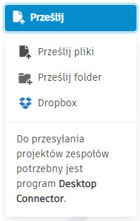 Wróćmy do zakładki z widokiem plików dysku. Dzięki poleceniom lewego menu łatwo utworzyć nowy folder albo umieścić w chmurze (przesłać) pojedynczy plik albo cały folder danych. Ciekawe, że mamy też integrację z DropBox, która otwiera okno dysku DropBox i pozwala wskazać w nim plik, w celu przetransferowania do Autodesk Drive.