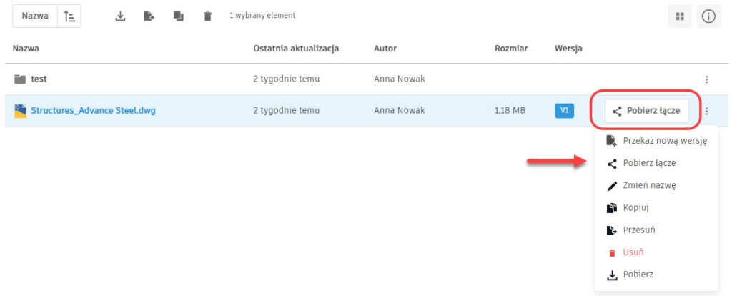 Analogiczne menu dla plików zawiera polecenie Pobierz łącze, które należy wybrać, aby udostępnić dany plik innym osobom. W widoku listy przycisk udostępniania Pobierz łącze jest dostępny na osobnym przycisku, jak niżej.