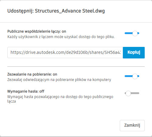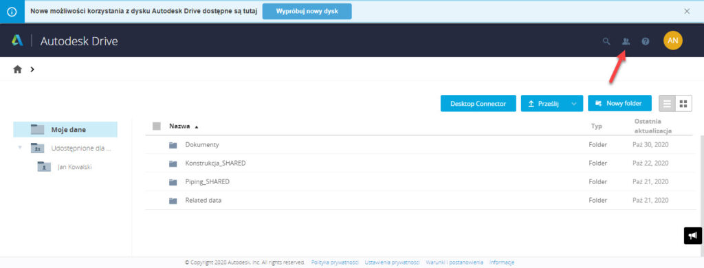 Dobra wiadomość jest taka, że starsza wersja interfejsu Autodesk Drive jest nadal obsługiwana. Znajdziemy w niej ikonę jak i uruchomimy współdzielenie.