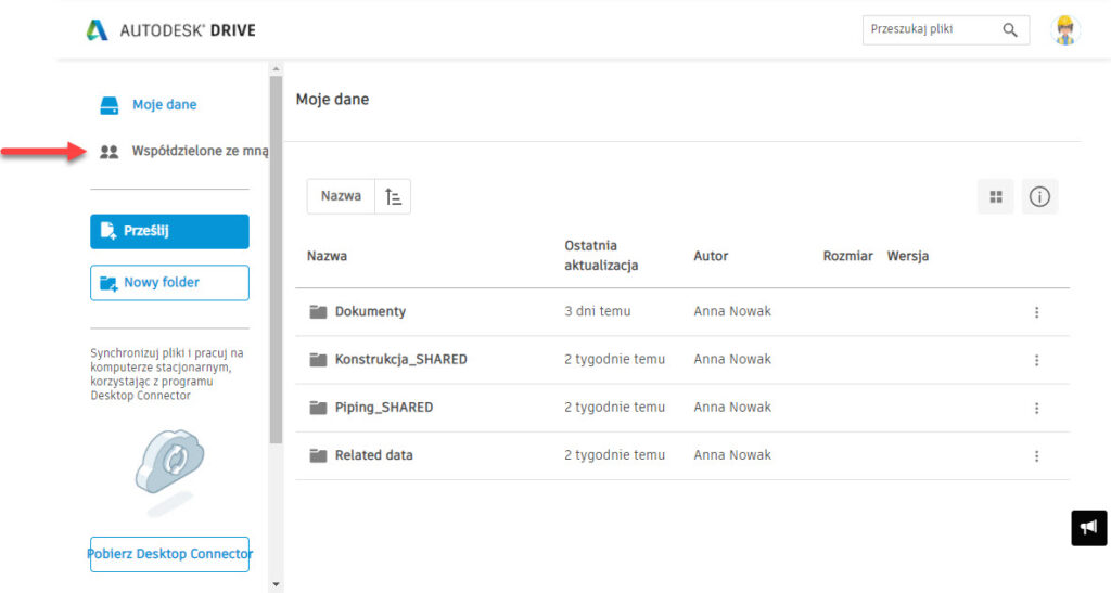 Otóż istnieje możliwość udostępnienia całego naszego dysku. Dokładniej rzecz ujmując, istniała w starszej wersji interfejsu Autodesk Drive. Obszar Współdzielone ze mną jest obecny w nowej wersji interfejsu, gdyż pozwala to zachować zgodność ze starszą wersją Autodesk Drive, aby nadal korzystać z udostępnionych nam w starszej wersji dysków. W najnowszej wersji interfejsu obsługi próżno szukać (na dziś) sposobu na zaproszenie do współdzielenia dysku.