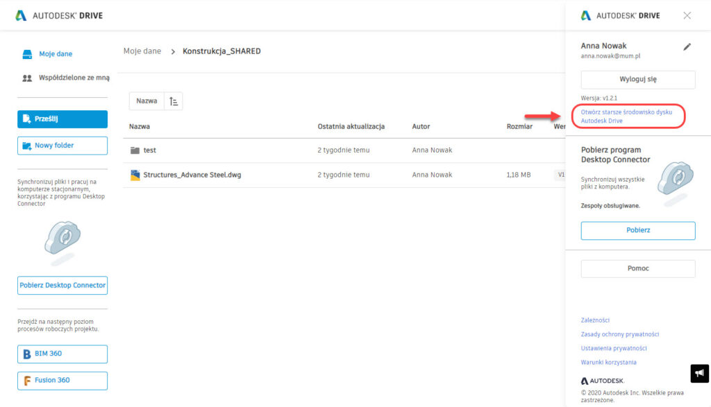 Strona internetowa dysku Autodesk otwiera się nam zawsze w najnowszej wersji, jeśli jednak klikniemy na okrągłą ikonkę, symbolizującą nasz profil w prawym górnym rogu i rozwiniemy paletę szczegółów profilu, znajdziemy tam skrót Otwórz starsze środowisko dysku Autodesk Drive. Widoczna jest też bieżąca wersja dysku i dodatkowe polecenia, jak np. pobranie programu Desktop Connector, o którym powiem nieco później.