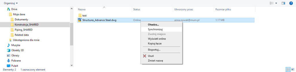 Kiedy zerkniemy w Eksploratorze Windows do zawartości folderów Drive, zauważymy kolumnę Status. Pliki, które znajdują się tylko w chmurze posiadają status Online. Pliki, posiadające kopię lokalną, mają status Zsynchronizowany. Polecenia menu prawego klawisza pozwalają synchronizować pliki, ułatwiają otwarcie czy skopiowanie łącza do schowka w celu udostępnienie pliku innym osobom (np. poprzez e-mail).