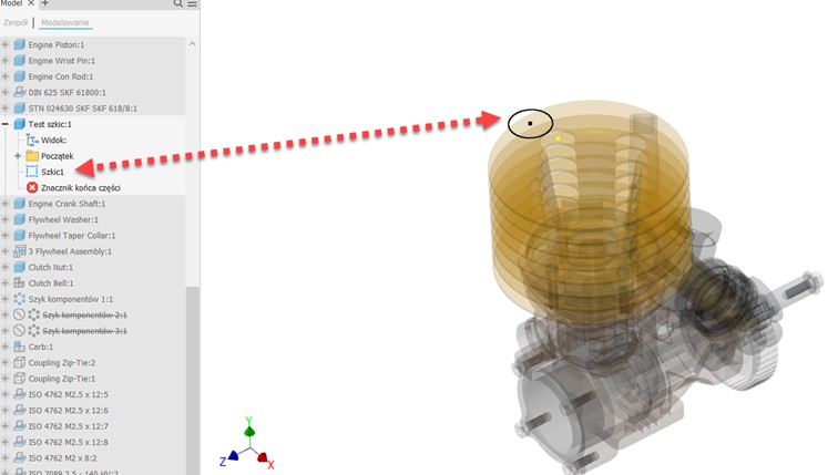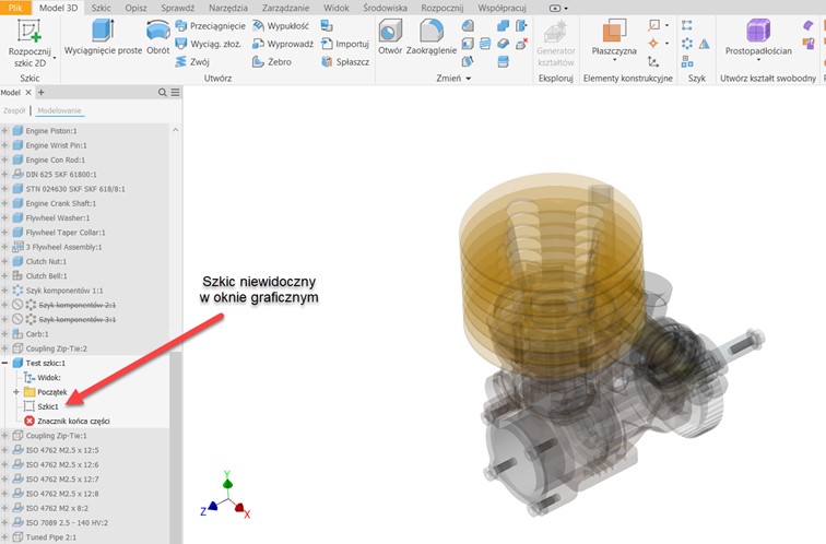 Jak zapewne większość z Was wie, Inventor umożliwia tworzenie i edytowanie części w kontekście złożenia. Podczas takiej edycji może się okazać, że jeżeli będziemy chcieli dokonać wyciągnięcia prostego, program nie będzie widział utworzonego przed chwilą szkicu. A sam szkic pomimo tego, iż ma włączoną widoczność nie będzie widoczny w oknie graficznym.