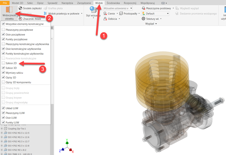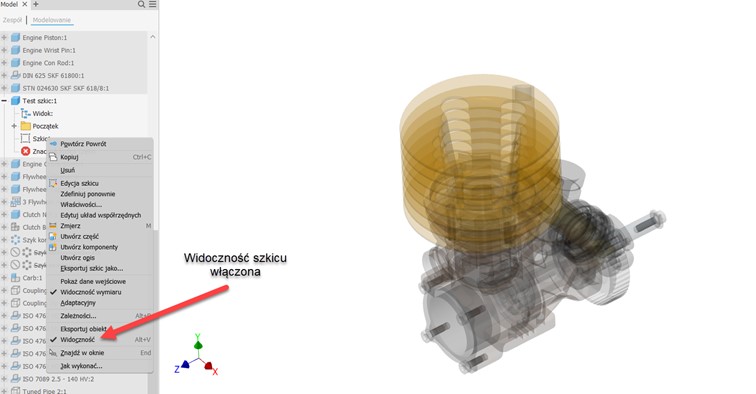 Dzieje się tak dlatego, że widoczność Szkiców 2D jest wyłączona w pliku złożenia, więc gdy przechodzimy do edycji części w kontekście złożenia to również w tej części szkice okazują się być niewidoczne. Wystarczy przejść na wstążce do zakładki Widok, a następnie rozwinąć listę Widoczność obiektu i zaznaczyć widoczność dla Szkice 2D, aby szkic był widoczny i dostępny w operacjach modelowania.
