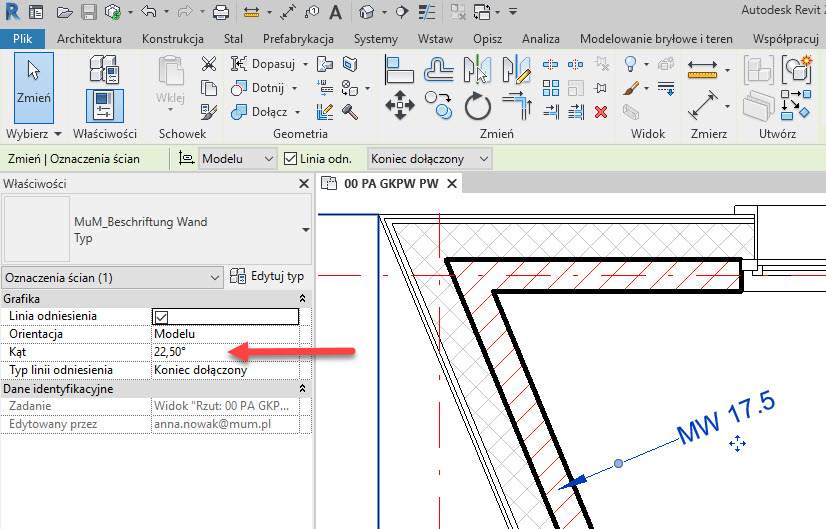W trybie edycji oznaczenia można zauważyć na panelu Właściwości nowy parametr elementu Kąt. Opcja jest szczególnie przydatna dla modeli podłączonych, które są obrócone o pewien kąt i chcemy uzyskać kąt obrotu nowych oznaczeń w modelu nadrzędnym zgodny z opisami modelu podłączonego.