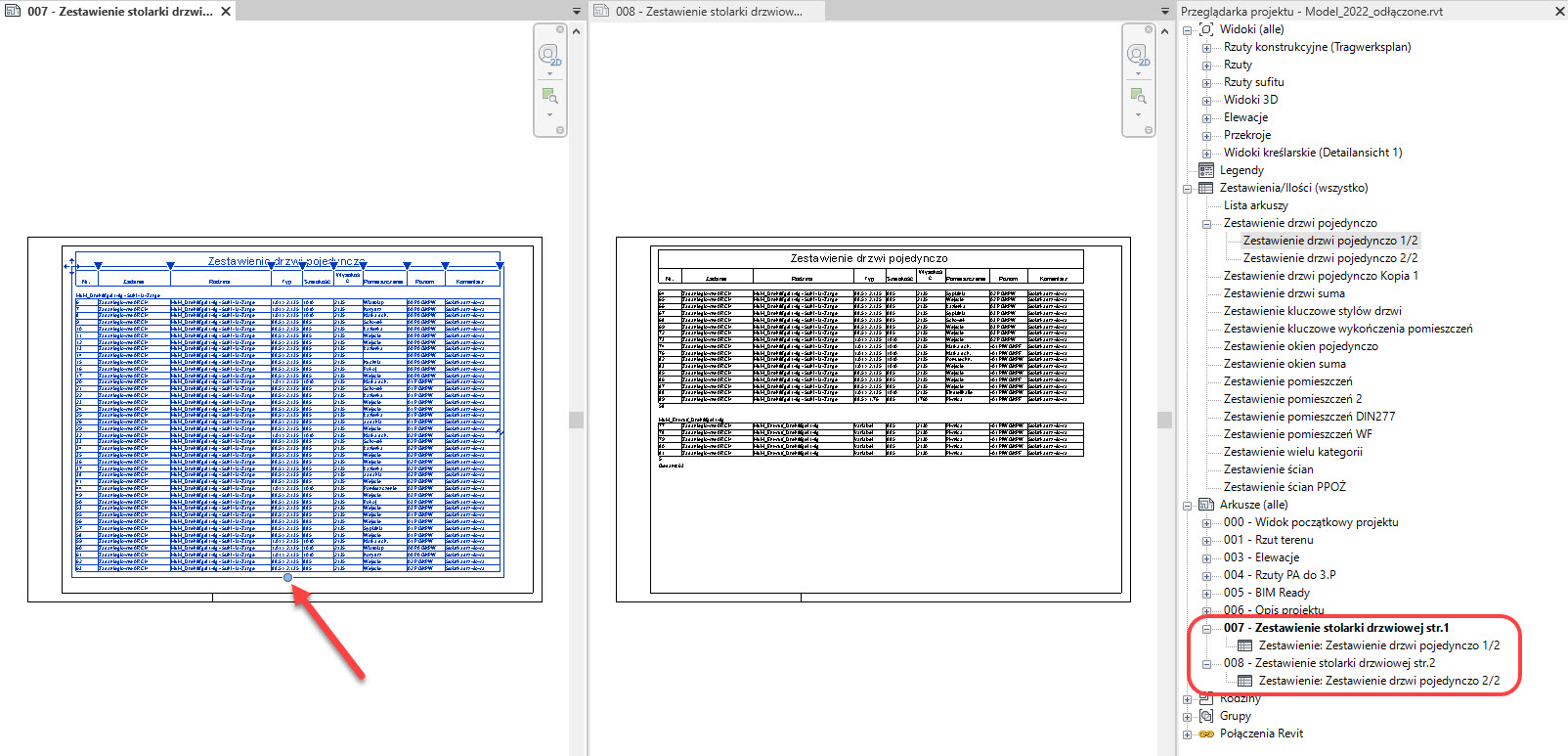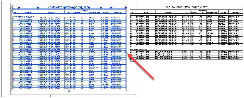 Aby umieścić oddzielone poszczególne części tabeli na innych arkuszach wystarczy przeciągnąć je z Przeglądarki projektu na arkusz, tak samo, jak dla innych widoków, a na arkuszu bazowym, w którym dokonaliśmy podziału po prostu usunąć zbędne części. Nadal zestawienie jest całością, podlega pod te same ustawienia, nadal tekst przepływa między częściami podziału, tak, jak to było dla zestawienia podzielonego na jednym arkuszu w poprzednich wersjach.