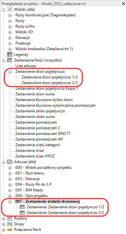 Możliwość dzielenia długich zestawień na arkuszach to nic nowego. Ale już rozmieszczenie segmentów tak podzielonego zestawienia na różnych arkuszach to nowość Revit 2022. Funkcjonalność może być przydatna na przykład wtedy, gdy chcemy wydrukować długie zestawienie na małym formacie arkusza i zachować czytelną wielkość czcionek. Po podzieleniu zestawienia na arkuszu znacznikiem tyldy na bocznej krawędzi, poza oczywistym podzieleniem tabeli, można zauważyć w Przeglądarce projektu zmianę w strukturze zestawienia, widoczną też w sekcji Arkusze dla bieżącego arkusza.