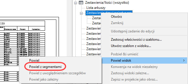 Zatem podział jest zapamiętany jako dodatkowa cecha zestawienia. Dzięki temu podczas powielania widoków zestawień mamy teraz do dyspozycji poza standardowym poleceniem Powiel dodatkowe polecenie Powiel z segmentami,służące do uzyskania kopii zestawienia z zachowaniem zdefiniowanego na arkuszu podziału.