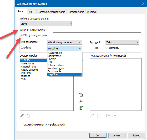 Przyjrzyjmy się zmianom w oknie dialogowym definiowania tabeli zestawienia Nowe zestawienie/ilości. Dostępne są wszystkie kategorie modelu Revit, także nowe. Załóżmy, że tworzę nową tabelę zestawienia Drzwi. Na marginesie wspomnę, że dla Nowy przedmiar materiałowy ilość dostępnych kategorii i podkategorii jest teraz znacznie większa. Ale wróćmy do tworzenia zestawienia drzwi. Zakładka Pola okna Właściwości zestawienia jest wyposażona w nowe narzędzia wyszukiwania i filtrowania dostępnych parametrów, dzięki czemu odnalezienie i prawidłowa identyfikacja parametru są nieporównywalnie łatwiejsze. Można zatem wyszukać nazwę albo fragment nazwy parametru i odfiltrować dostępne parametry po typie parametru (wbudowany, wbudowany projektu, współdzielony parametr rodziny, współdzielony parametr projektu…), dziedzinie (wspólne, HVAC, orurowanie… itp.), typie wartości (tekst, materiał, długość, objętość… itp.) oraz po rodzaju (parametr elementu, parametr typu).
