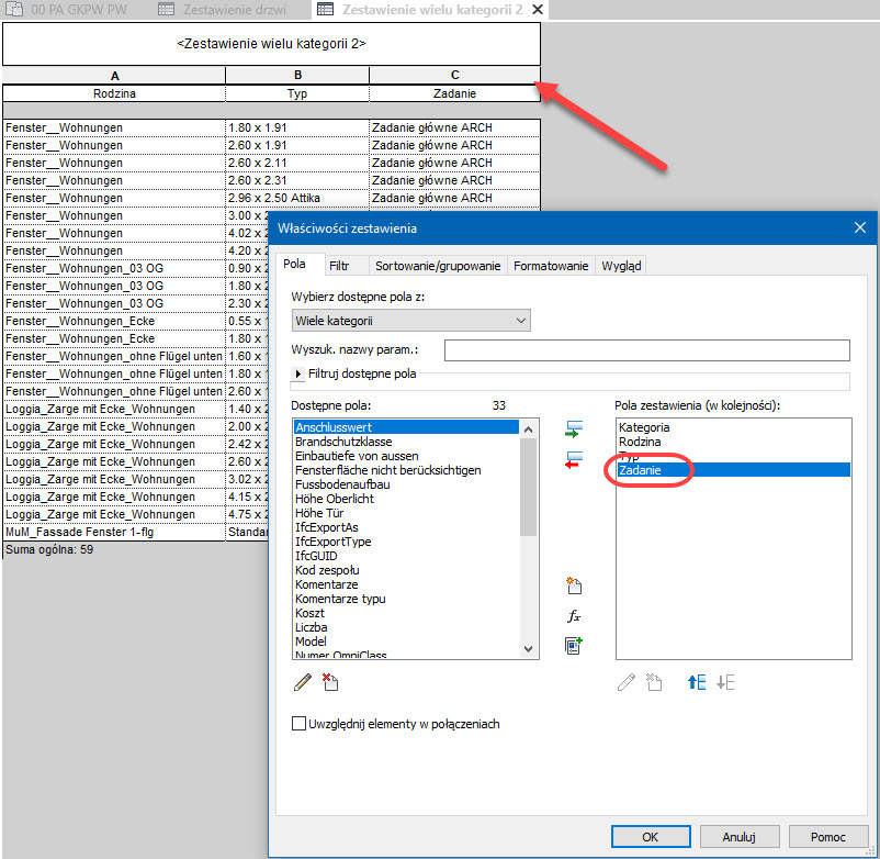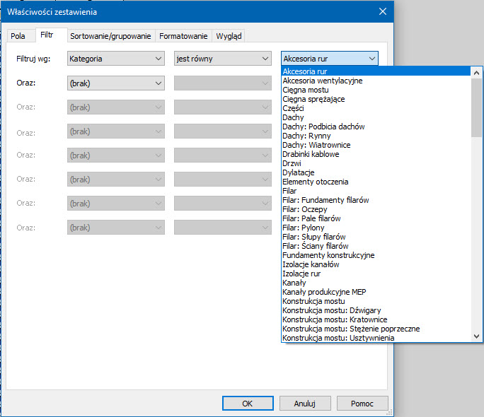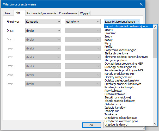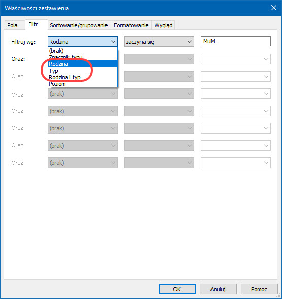 Jeśli do pól zestawienia dodaliśmy pola Rodzina, Typ, albo Rodzina i Typ, to w zakładce Filtr okna Właściwości zestawienia z pewnością zauważymy, że od tej wersji Revit będziemy mogli filtrować zestawienie według tych pól.