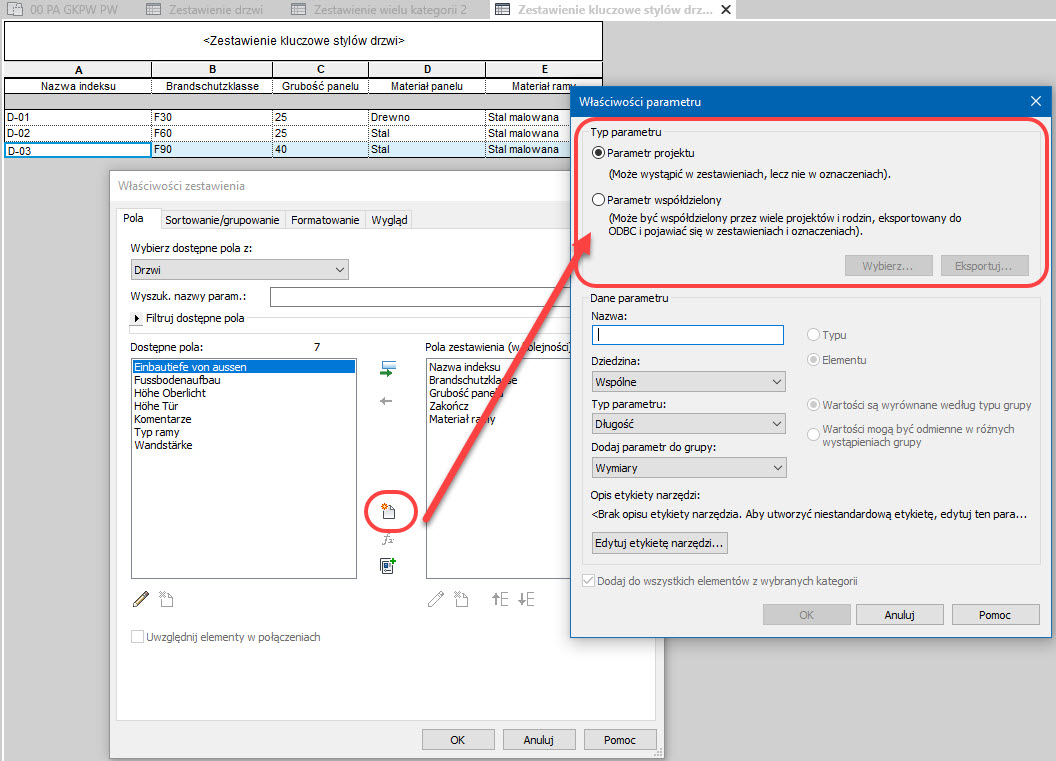 W przypadku tworzenia zestawień kluczowych, takich, jak zestawienia kluczowe wykończenia pomieszczeń albo zestawienia kluczowe osprzętu drzwi, Revit 2022 pozwala korzystać nie tylko z parametrów wbudowanych i parametrów projektu, ale również z parametrów współdzielonych. Podczas tworzenia nowego parametru zestawienia kluczowego obszar zmiany typu parametru projektu na parametr współdzielony jest aktywny, podczas gdy Revit 2021 pozwalał tylko na tworzenie nowych parametrów projektu.