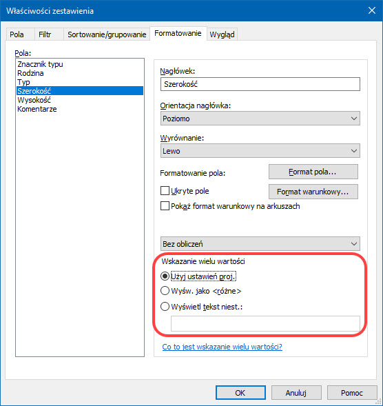 Jeśli wartości parametru oznaczenia są różne, zostanie wyświetlony tekst <różne>. W dalszej części tego wpisu, przy omawianiu nowości dla zestawień, powiem, jak zmienić ten tekst na inny w skali projektu projektu.