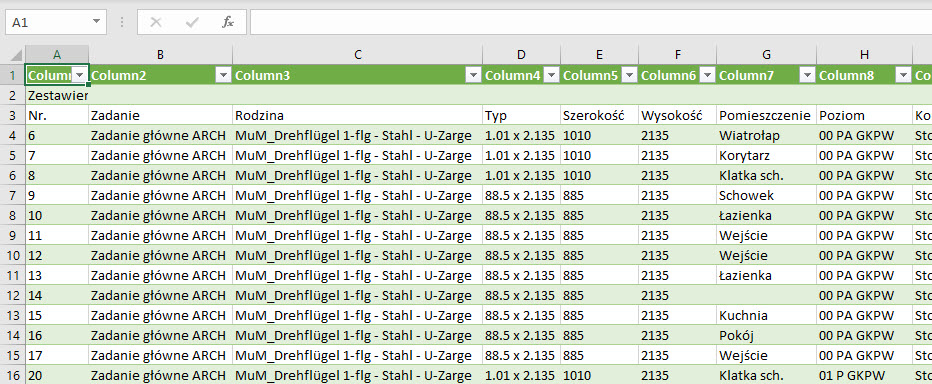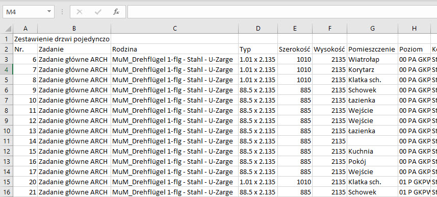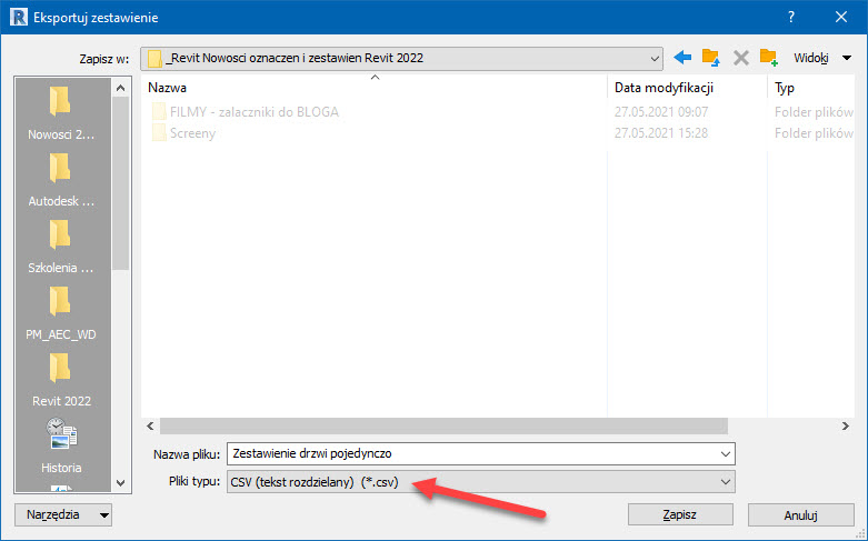 Następnie z poziomu widoku zestawienia w Revit poleceniem z menu Plik > Eksportuj > Raporty > Zestawienie określamy położenie pliku eksportu. Domyślnie jest to właśnie .CSV.
