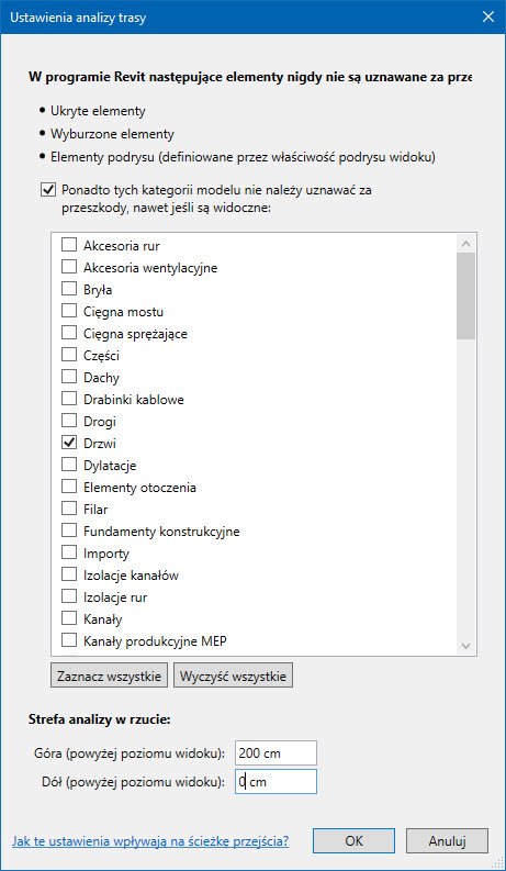 Na początek otwieram w programie Autodesk Revit przykładowy projekt i uaktywniam widok rzutu tego projektu, który posłuży do testów działania skryptu. W rzucie są już rozmieszczone pomieszczenia. W okienku Ustawienia dla Analizy trasy upewniam się, że jedyną kategorią, wykluczoną z listy przeszkód, są Drzwi.