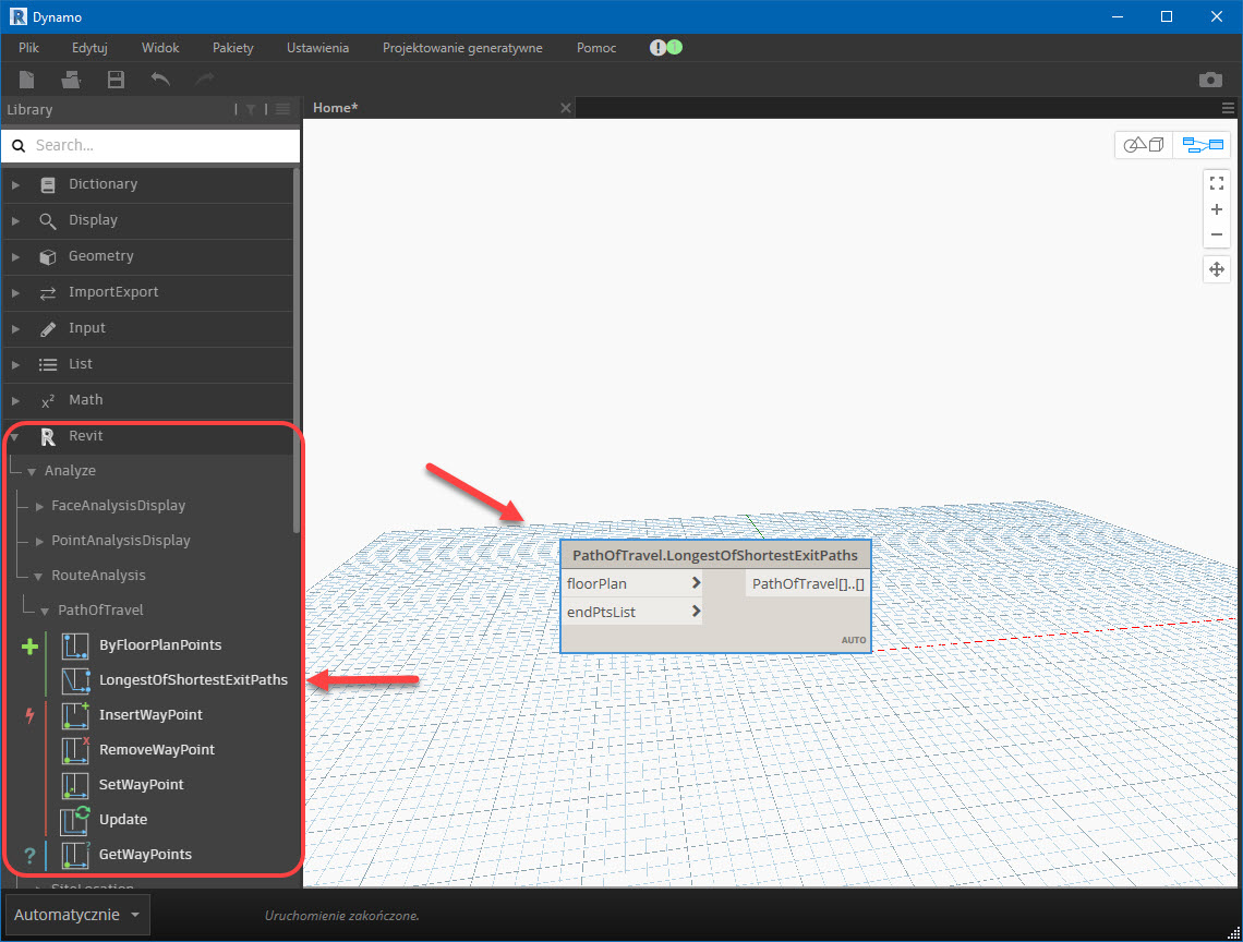 Po lewej stronie okna Dynamo, na liście węzłów, rozwijam strukturę drzewka: Revit > Analyze > RouteAnalysis > PathOfTravel. Klikam węzeł LongestOfShortestExitPath, który wykona za nas robotę poszukiwania najdłuższej trasy. Blok okienka węzła pojawia się w oknie zawartości skryptu, jak niżej.