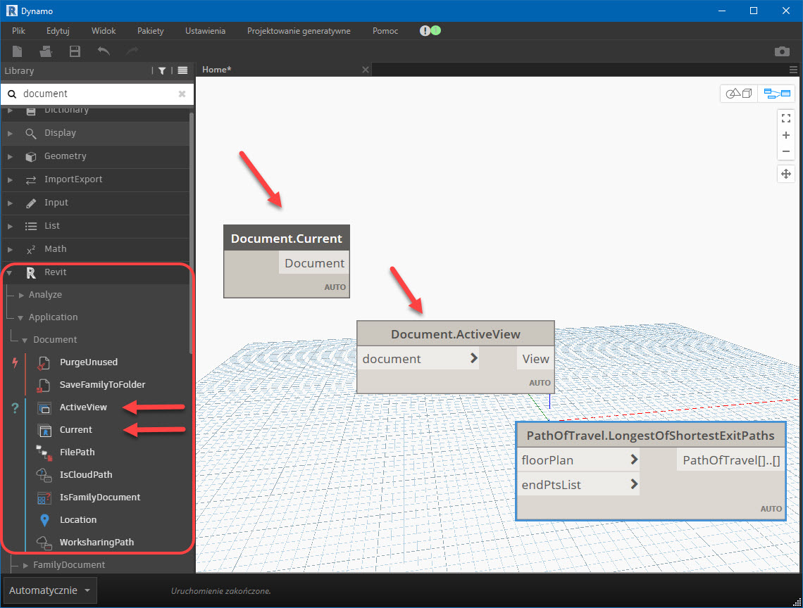 Wyszukuję i dodaję jeszcze dwa węzły: Revit > Application > Document > Current (Document.Current), określający jako źródło informacji bieżący dokument w Revit oraz Revit > Application > Document > ActiveView (Document.ActiveView), określający jako źródło informacji aktywny widok tego dokumentu (projektu).