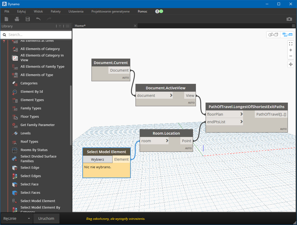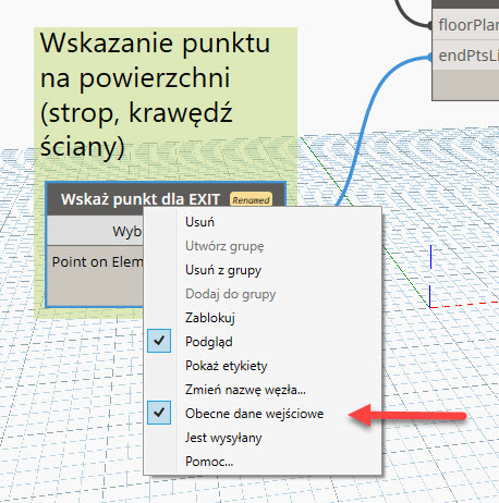 Gdyby chcieć zmienić nasz skrypt tak, aby program pozwalał wskazać punkt docelowy, a nie pomieszczenie, należałoby usunąć ze skryptu dwa węzły: Room.Location oraz Select Model Element i w ich miejsce dodać węzeł Revit > Selection > Select Point on Face (Select Point on Face). Zgodnie z nazwą, pozwala on na wskazanie punktu na powierzchni – musimy mieć zatem jakiś obiekt do wybrania punktu docelowego ścieżki ewakuacji – jak np. punkt na powierzchni stropu.