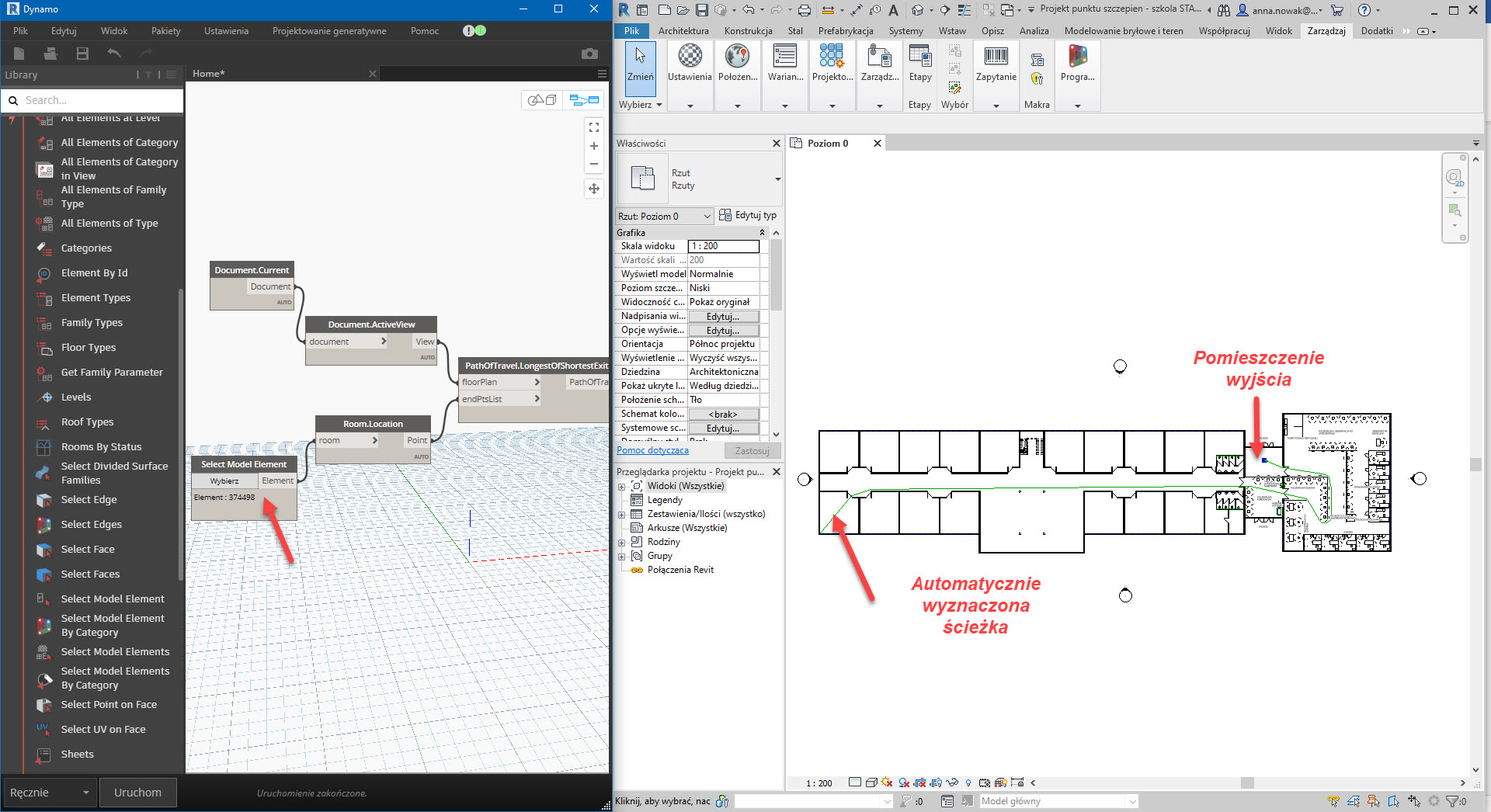 Pora na test skryptu. Ustawiam okno Dynamo i okno Revit z rzutem obok siebie. Klikam przycisk Wybierz dla Select Model Element. Ponieważ program oczekuje na wybór pomieszczenia, wskazuję pomieszczenie hallu wejściowego (łącznik między skrzydłem a dużą salą. Blok węzła nie jest już pomarańczowy, tylko szary i pokazuje ID wybranego elementu.