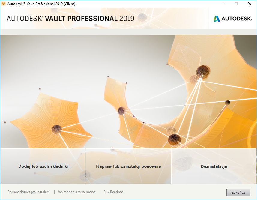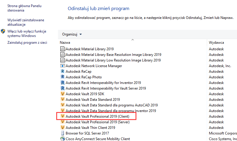 Aby to zrobić, należy przejść do: Panel sterowania à Programy i funkcje. Na liście zainstalowanych programów wyszukujemy pozycję Autodesk Vault wersja 20xx (Client).