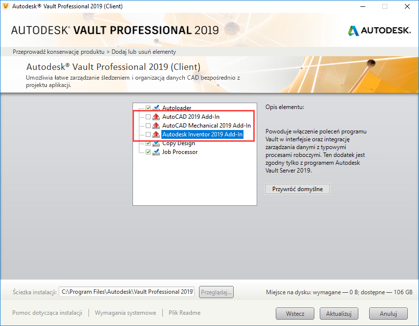 Zaznaczamy pozycje, które chcemy zainstalować i klikamy Aktualizuj. Po zakończeniu pracy instalatora brakujące elementy powinny być już dostępne.