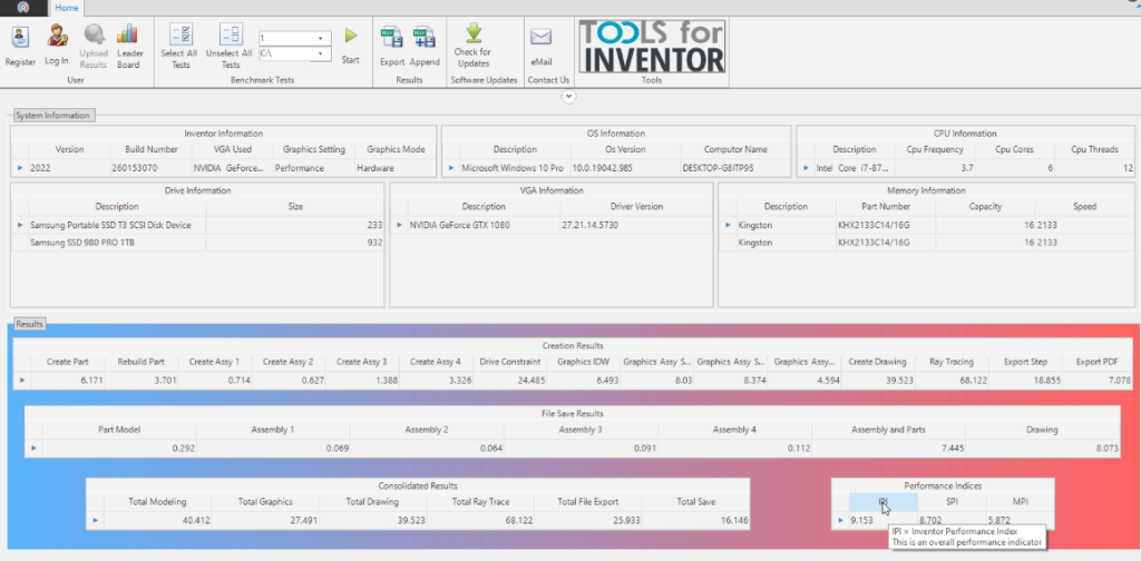 Po uruchomieniu programu klikamy zieloną strzałkę na wstążce o nazwie „Start” i czekamy na zakończenie procesu. W trakcie będą pojawiać się i przełączać kolejne testy wydajnościowe. Dzięki podglądowi będzie można na żywo ocenić jak płynnie pracuje Inventor przy dość dużych obciążeniach. Na sam koniec uzyskamy tabelę z podsumowaniem, w którym oprócz niezbędnych informacji na temat sprzętu i ogólnego wyniku IPI, będziemy mogli sprawdzić szczegółowe wartości przeprowadzanych testów.