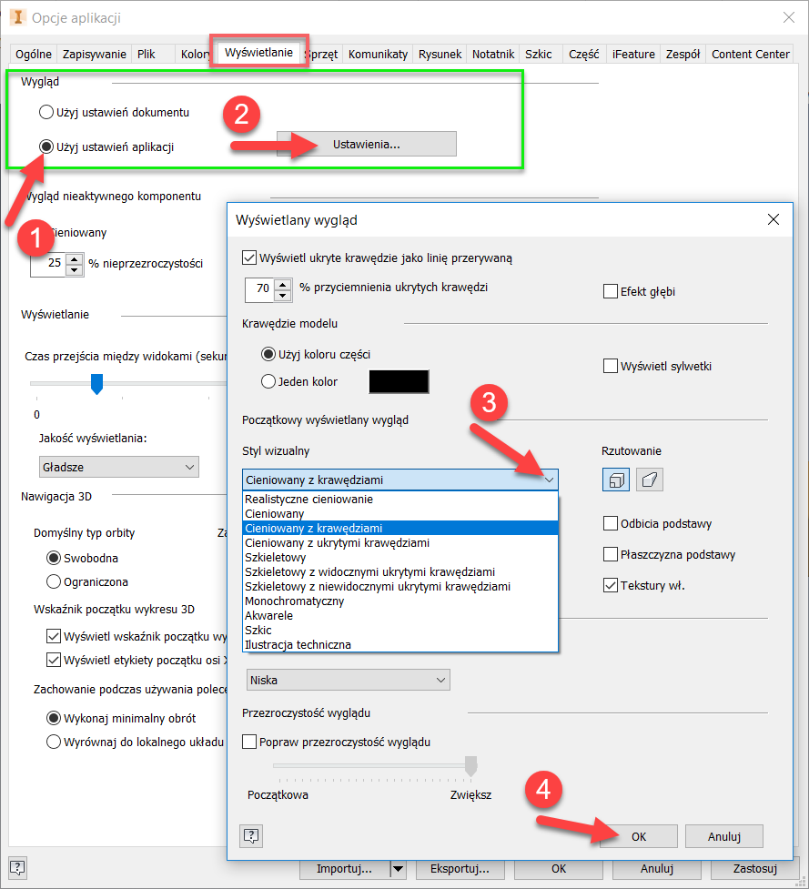 W nowo otwartym okienku Opcje aplikacji w zakładce Wyświetlanie w obszarze Wygląd znajdziemy dwie opcje: Użyj ustawień dokumentu (jest to opcja domyślna) oraz Użyj ustawień aplikacji. Aby ustawić globalnie jednakowy styl wizualny dla wszystkich plików należy wybrać tę drugą opcję. Następnie aby wybrać jaki to ma być styl konieczne jest kliknięcie w Ustawienia… i w nowo otwartym oknie Wyświetlany wygląd znajdziemy rozwijalną listę stylów z których należy wybrać preferowany i zaakceptować wybór zamykając okienko ikonką OK.