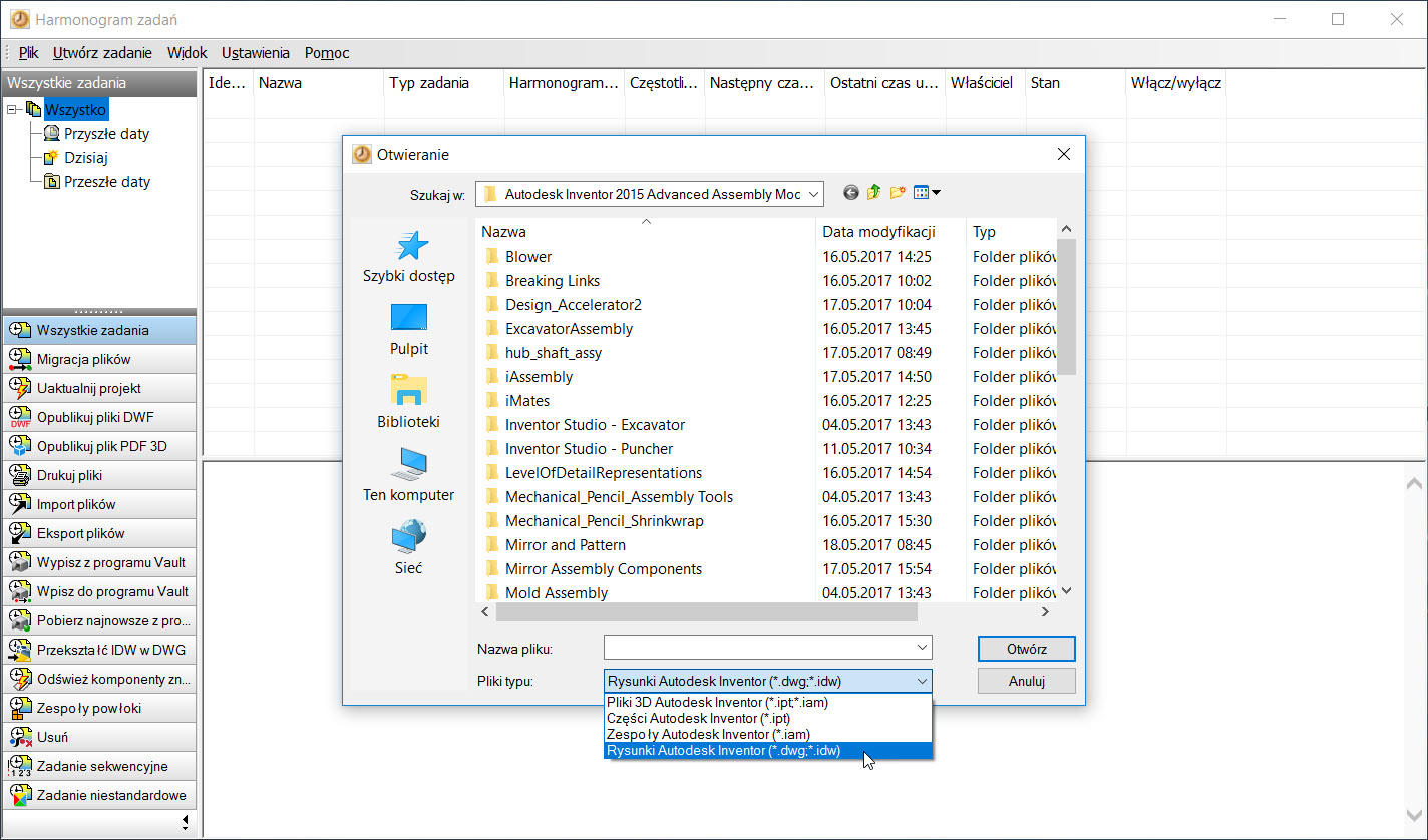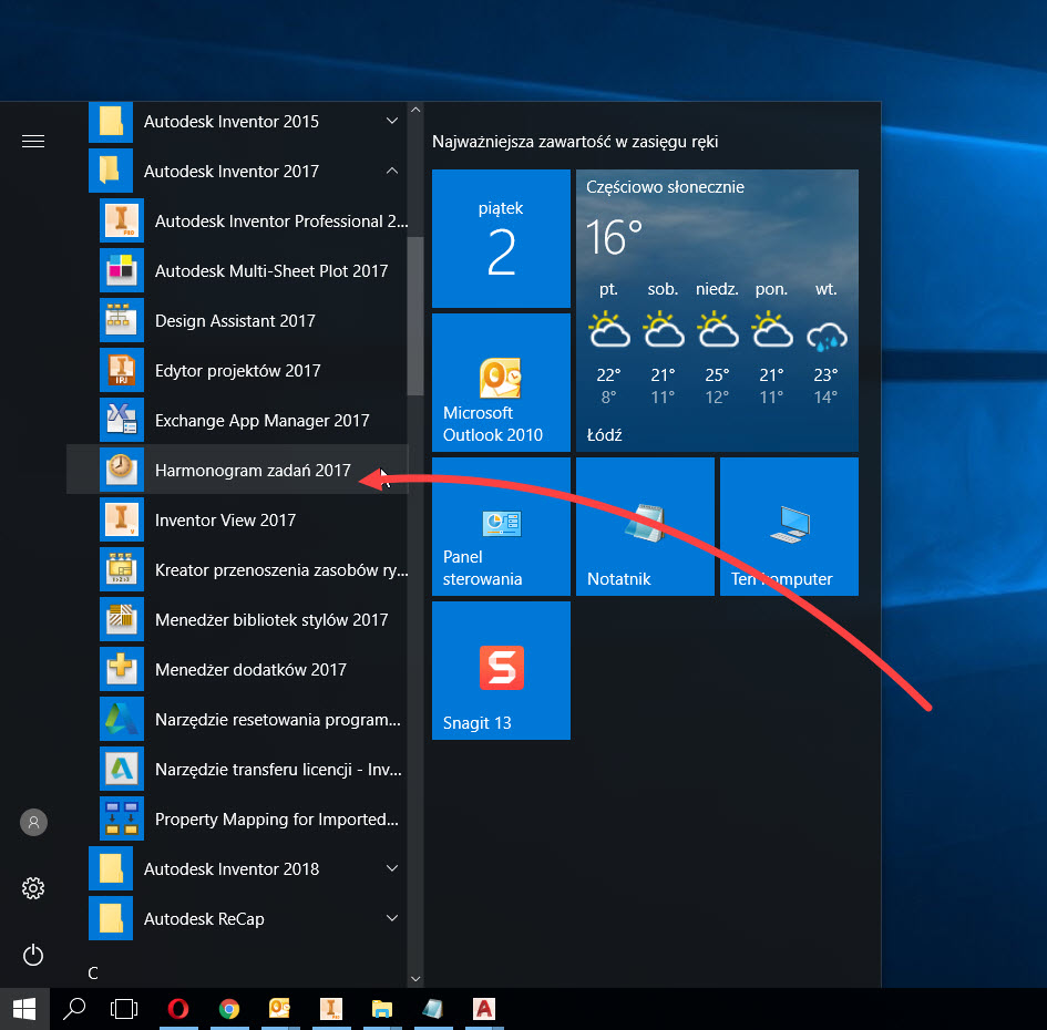 Odszukujemy w Menu Start w folderze Inventora program Harmonogram zadań zgodnie z wersją oprogramowania, którą posiadamy.