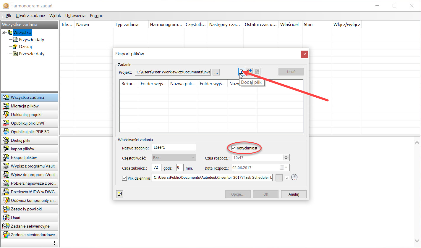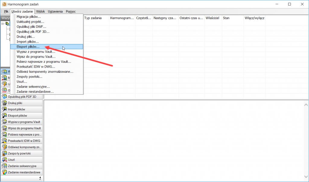 Niejednokrotnie taką dokumentację należy wyeksportować do innych formatów plików, m.in. .dwg czy .dxf., by wysłać je np. do wykonawcy zewnętrznego. W przypadku pojedynczych akcji nie jest to zbyt uciążliwe, natomiast jeśli ich liczba zaczyna rosnąć, staje się to dość czasochłonne. Z pomocą przychodzi nam program „Harmonogram Zadań”. Dzięki niemu możemy bez ponownego otwierania plików dokonać eksportu, a nawet zaplanować wykonanie zadań po godzinach, w których aktywnie użytkujemy komputer.