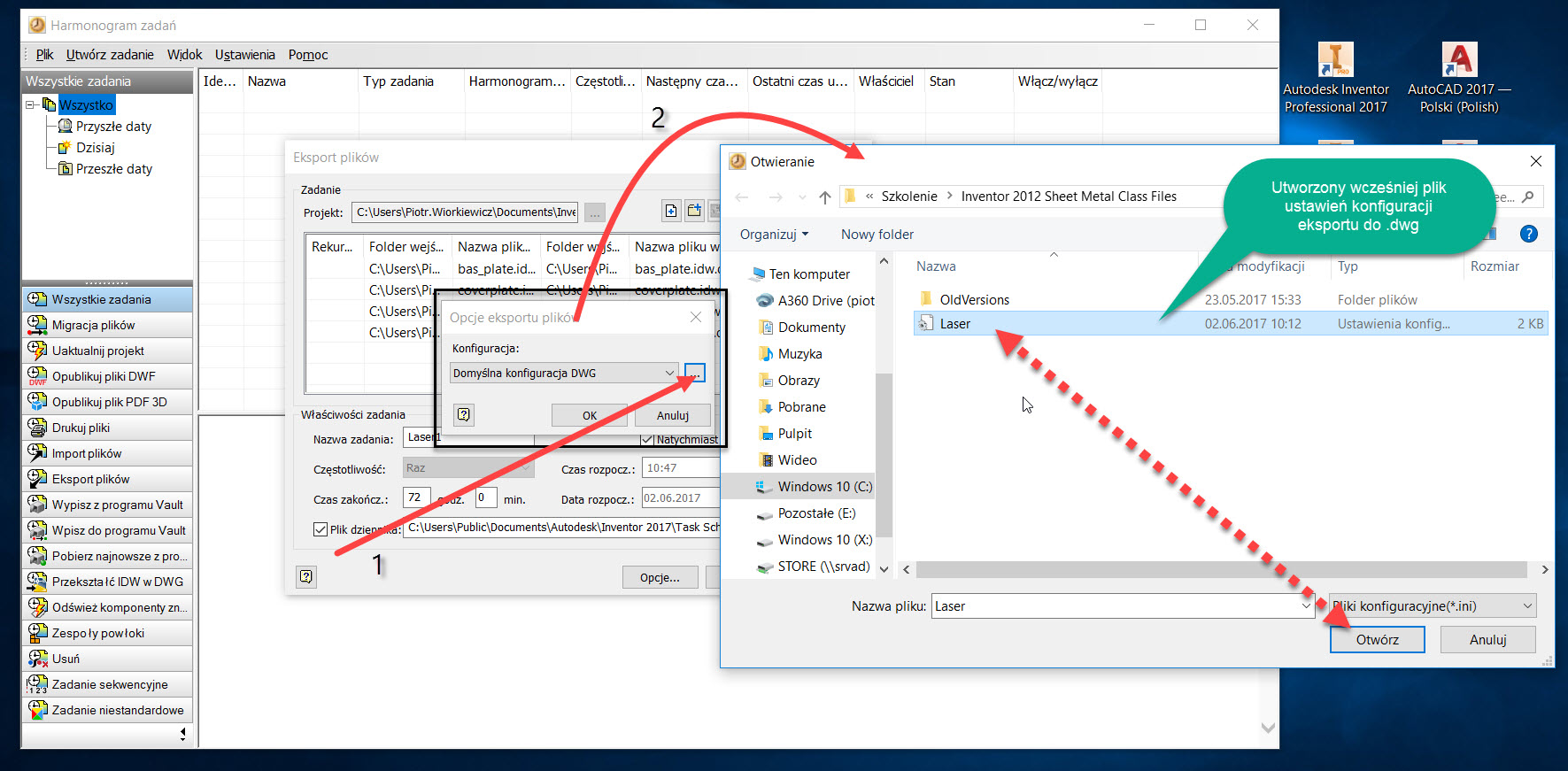 Klikając przycisk Opcje pojawia się małe okno, należy kliknąć przycisk … (nr 1), pojawi się kolejne okno, w którym należy wybrać plik konfiguracji eksportu do .dwg. Po zaznaczeniu odpowiedniej konfiguracji i kliknięciu Otwórz, należy w pozostałych oknach zatwierdzić zmiany przyciskiem OK. Pojawia się pasek postępu i pliki generowane są domyślnie w folderze, w którym znajdują się oryginały.