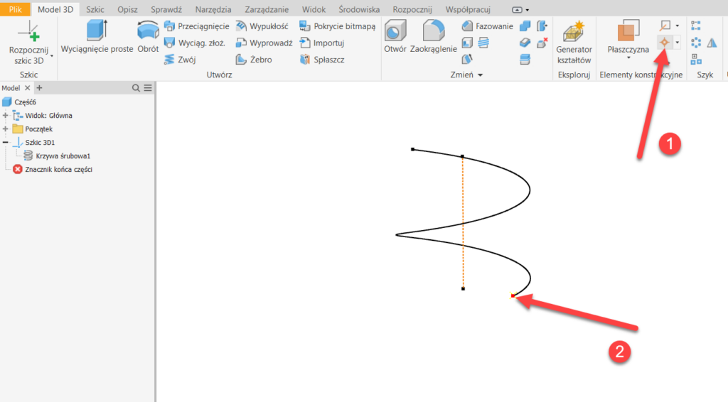 - Teraz muszę umieścić jakiś element, który będę powielał w części – będzie to „szablon” dla późniejszego szyku w pliku złożenia. W moim przykładzie wstawię punkt konstrukcyjny w punkcie początkowym krzywej helikalnej.