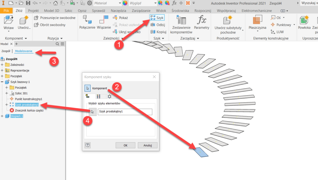 - I teraz najciekawsze, czyli szyk części po krzywej. Wybieram polecenie Szyk. W oknie dialogowym Szyk komponentu jako komponent do powielenia wskazuję wstawiony przed chwilą stopień. Następnie przełączam wygląd przeglądarki na drzewko modelowania (3) i wskazuję szyk w pliku części.