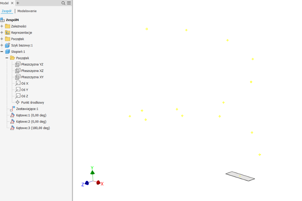 - Plik ze stworzonym przed chwilą szykiem wstawiam do pliku złożenia. Wstawiam również przygotowany wcześniej plik części (w moim przypadku stopień). Następnie za pomocą wiązań, wiążę stopień z pierwszym punktem konstrukcyjnym.