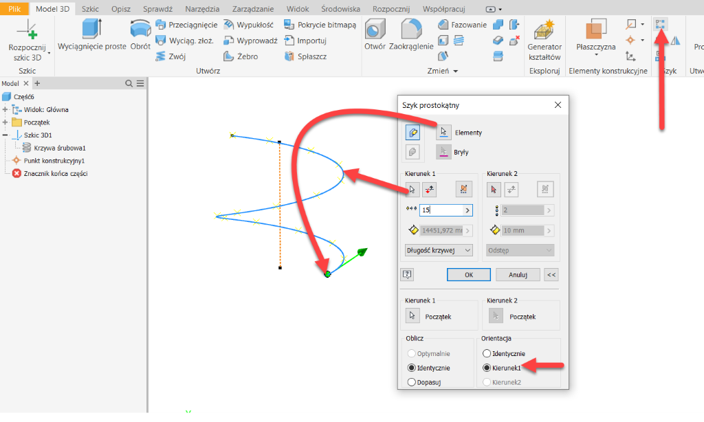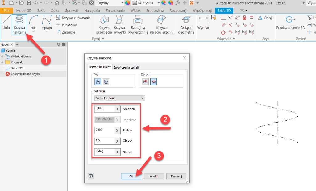 - Uruchamiam polecenie Krzywa helikalna i wprowadzam parametry krzywej według potrzeb