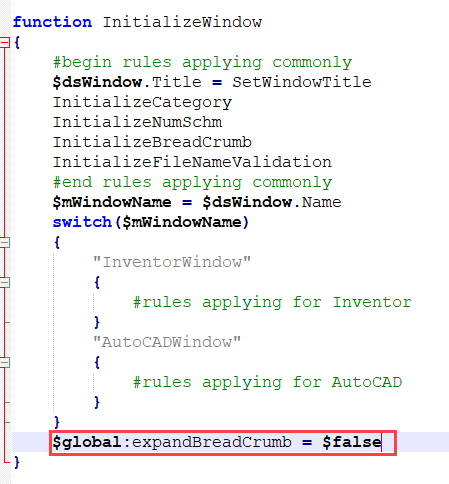 Plik tej jest plikiem zawierającym funkcje napisane w języku skryptów programu Powershell. Zmianę wprowadzimy w jednej z zawartych wnim funkcji więc najpierw całą skopiujemy do nowo utworzonego pliku. Musimy w oryginalnym pliku odnaleźć funkcję InitializeWindow, która jest na samym jego początku. Kopiujemy ją do pliku Default.ps1 w folderze CAD.Custom\addins i zmieniamy wartość zaznaczonej linii zgodnie z poniższym: