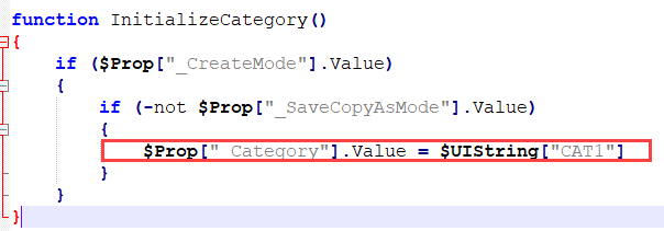 Wybór domyślnej kategorii wymaga także edycji pliku Default.ps1. Tym razem skopiujemy do pliku w folderze CAD.Custom\addins funkcję InitializeCategory z pliku oryginalnego, która wygląda tak: