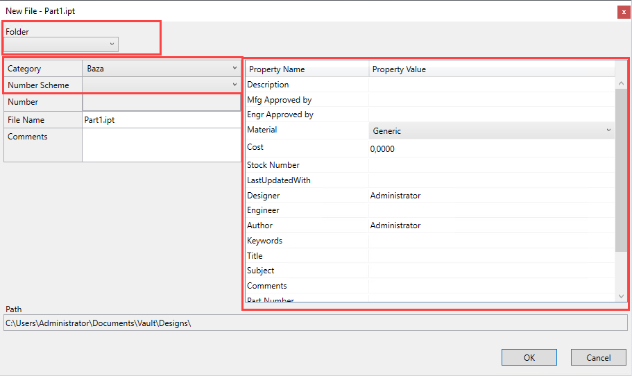 Zostały utworzone wpisy dla każdej właściwości programu Vault przypisanej do kategorii Baza i posiadającej odpowiednie połączenie z iProperties. Aby uzyskać wpisy dla pozostałych kategorii musimy zapisać nowy plik w każdej z tych kategorii. Plik nie musi być wpisywany do Vault, wystarczy zapis w obszarze roboczym projektu. Oczywiście wystarczy zapisać pliki tylko w tych kategoriach, które będą tworzone w programie Inventor. W naszym przykładzie będą to dodatkowo Inżynieria, Rysunki. Odpowiednie sekcje zostaną dodane w pliku konfiguracji: