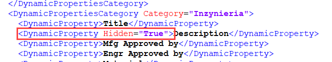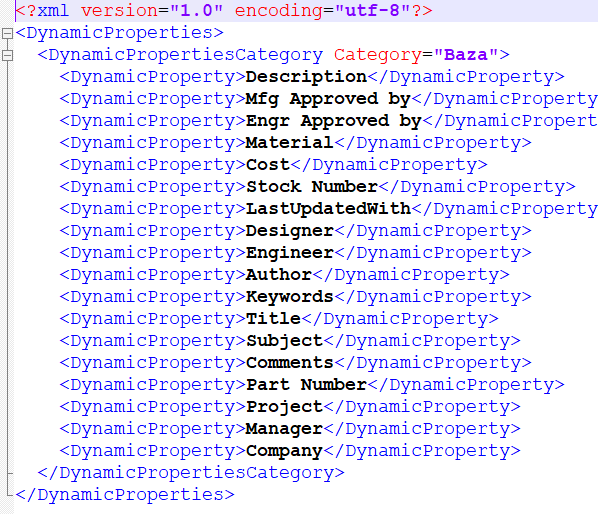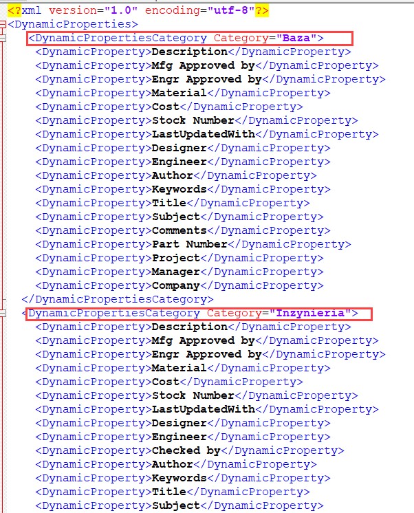 Aby zmienić zachowanie listy właściwości będziemy edytować plik InventorDynamicProperties.xml. Zostanie on automatycznie utworzony w folderze CAD.Custom\Configuration w momencie zapisu pierwszego pliku. Tak wygląda jego zawartość po zapisaniu pliku w kategorii Baza: