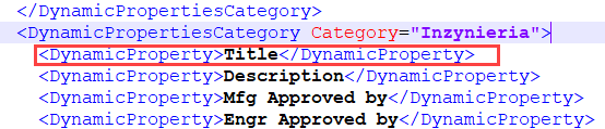 Jeżeli chcemy zmienić kolejność występowania właściwości na dynamicznej liście wystarczy zmienić kolejność ich występowania w pliku konfiguracji przenosząc cały wiersz odpowiadający danej właściwości w inne miejsce. W naszym przykładzie przeniesiemy właściwość obligatoryjną Title dla kategorii Inżynieria na pierwsze miejsce listy: