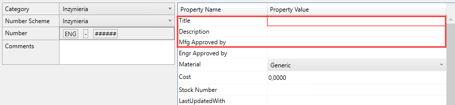 Dynamiczna lista właściwości pojawia się w prawej części okienka zapisu pliku w momencie wybrania z listy kategorii pliku. Wybór tej kategorii nie determinuje ostatecznej kategorii jaką Vault po wpisaniu przyporządkuje temu plikowi. Wpływa jedynie na zachowanie dynamicznej listy właściwości. Znajdują się na niej początkowo wszystkie standardowo zdefiniowane w Vault właściwości przypisane do wybranej kategorii będące zmapowane z odpowiednimi iProperties programu Inventor. Aby konfiguracja okienka była jak najmniej pracochłonna zalecane jest przystąpienie do tej czynności dopiero wówczas, gdy mamy zdefiniowane odpowiednie właściwości w programie Vault, przypiszemy je do kategorii oraz wykonamy potrzebne mapowania z iProperties. Wówczas lista właściwości będzie prezentowała wszystkie potrzebne pozycje.