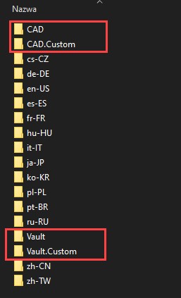 W poprzednich wpisach omówiłem foldery lokalizacji językowej. Dzisiaj pokażę przeznaczenie folderów *.Custom. Pojawiły się one w wersji 2018 i służą do przechowywania konfiguracji niestandardowej (użytkownika). Jeżeli chcemy wprowadzić jakiekolwiek zmiany w plikach konfiguracji standardowej zapisanych w folderach CAD albo Vault należy zmienione pliki zapiać w odpowiadającej im ścieżce w odpowiednim folderze *.Custom. Vault w pierwszej kolejności odczytuje ich zawartość i jest ona traktowana priorytetowo w stosunku do oryginalnej konfiguracji. Jeżeli popełnimy błąd uniemożliwiający działanie programu wystarczy wykasować bądź przenieść w inne miejsce zawartość folderów *.Custom i program działa z ustawieniami standardowymi.