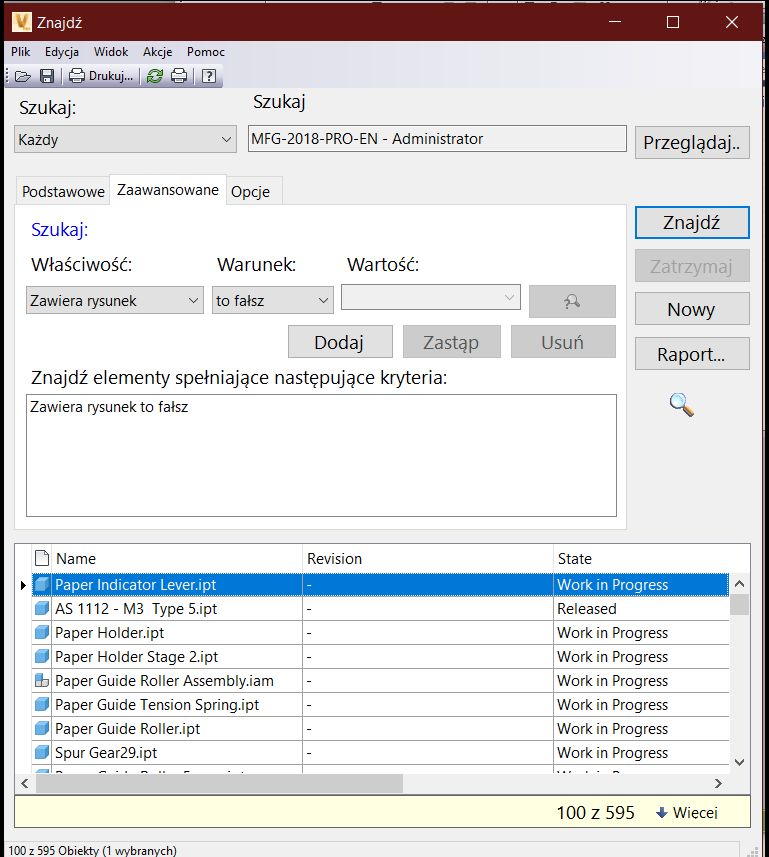 Znalezienie plików bez załączonej dokumentacji płaskiej nie było łatwym zadaniem. Od wersji 2020 pojawiła się nowa właściwość – „zawiera rysunek”, dzięki której bardzo łatwo można zbudować odpowiednie kryterium wyszukujące:
