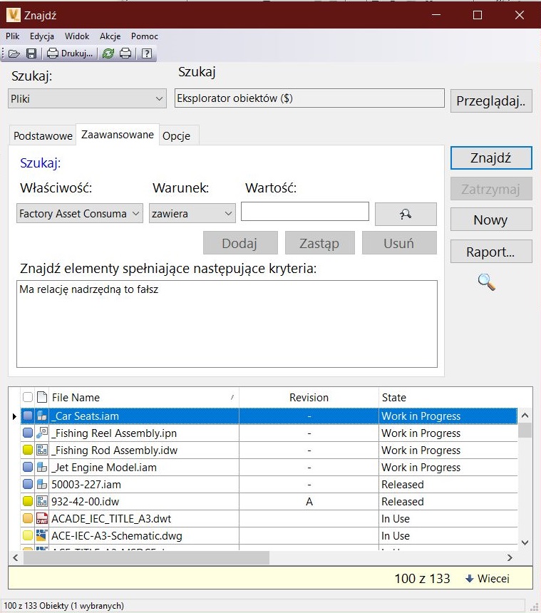 Problem ten prędzej czy później zechce rozwiązać każdy użytkownik Vault – znaleźć części, które nie są wykorzystywane w żadnym złożeniu. Przed wersją 2021 nie rozwiązywalny chyba, że ktoś jest biegły w Vault API. Od wersji 2021 pojawiła się właściwość „ma relację nadrzędną”. Dzięki niej łatwo odszukamy te pliki, które nie posiadają „rodziców”: