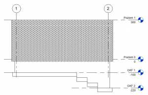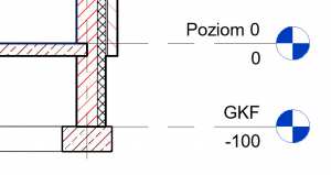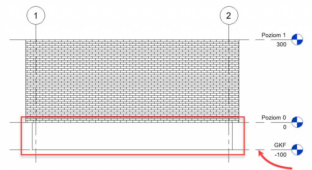 Na poniższym przykładzie poziom (pokazany strzałką) nazwałam GKF (Górny Poziom Fundamentu). Ściany konstrukcyjne fundamentowe zaczynają się na poziomie GKF i kończą na poziomie Poziom 0.