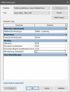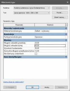 W moim przypadku chcę otrzymać ławę symetryczną względem fundamentowej ściany konstrukcyjnej. Poprzez Edytuj Typ powielam typ Ława nośna 900 x 300 i tworzę typ Ława nośna 600 x 300. Wskazanie ścian powoduje umieszczenie ław wzdłuż krawędzi.
